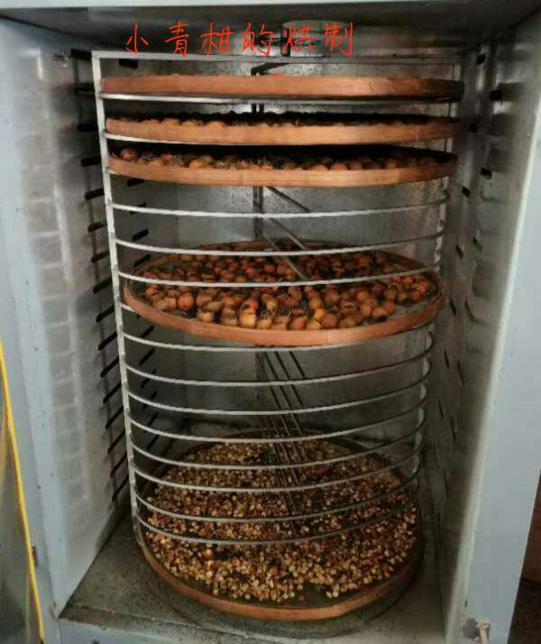 下面的是2018年12月公司用普洱的陳皮與公司的茶葉結(jié)合,制作的小青柑。青柑工藝種類的區(qū)別主要出現(xiàn)在干燥環(huán)節(jié),干燥方式的不同使之形成了不同的風(fēng)味與口感。烘制時間是18個小時,低溫烘焙,采用60℃左右的溫度,將小青柑烘焙至干燥。時間和成本雖有提高,但比起高溫烘焙工藝來說,口感更好,提香適當(dāng),兼以保持了活性,為后期轉(zhuǎn)化保留了空間。